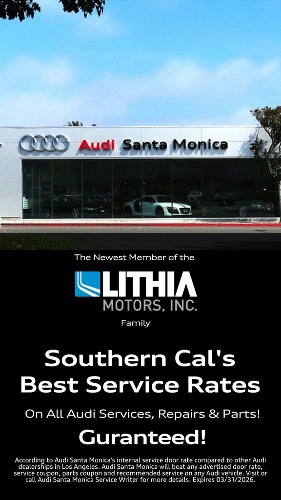 According to Audi Santa Monica's internal service door rate compared to other Audi dealerships in Los Angeles. Audi Santa Monica will beat any advertised door rate, service coupon, parts coupon and recommended service on any Audi vehicle. Visit or call Audi Santa Monica Service Writer for more details. Expires 03/31/2026.